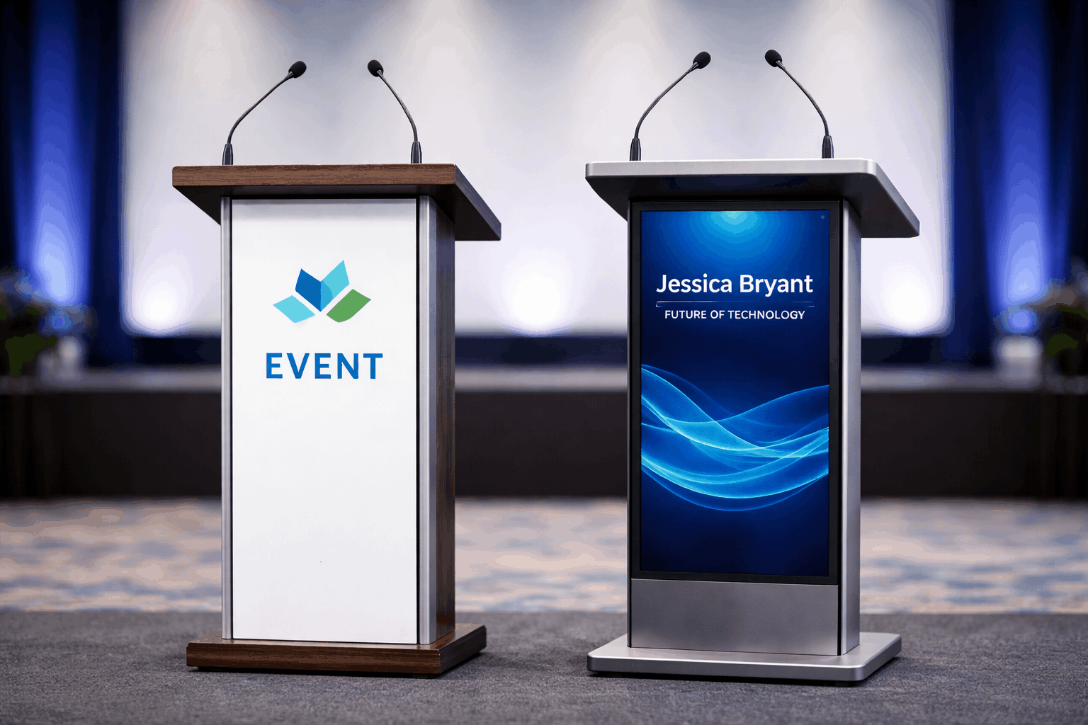 AVE Events Polska provides professional lectern and digital lectern rentals for conferences, corporate events, meetings, press conferences, and official ceremonies across Poland. Our offering includes classic branded lecterns and digital lecterns with dynamic on-screen branding, allowing event organisers to match the lectern format to their event structure and content flow.